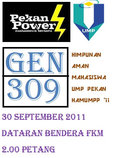 Esok. 30 September 2011, selepas Solat Jumaat, semua mahasiswa/i UMP Pekan bakal berhimpun dalam perhimpunan aman bagi menuntut hak mahasiswa berkaitan dengan penempatan & pengangkutan di UMP Pekan. Difahamkan bahawa, perhimpunan aman ini bertujuan untuk menyerahkan memorandum kepada NC UMP setelah segala ruang rundingan dan perbincangan antara mahasiswa dan staff UMP seakan-akan buntu.